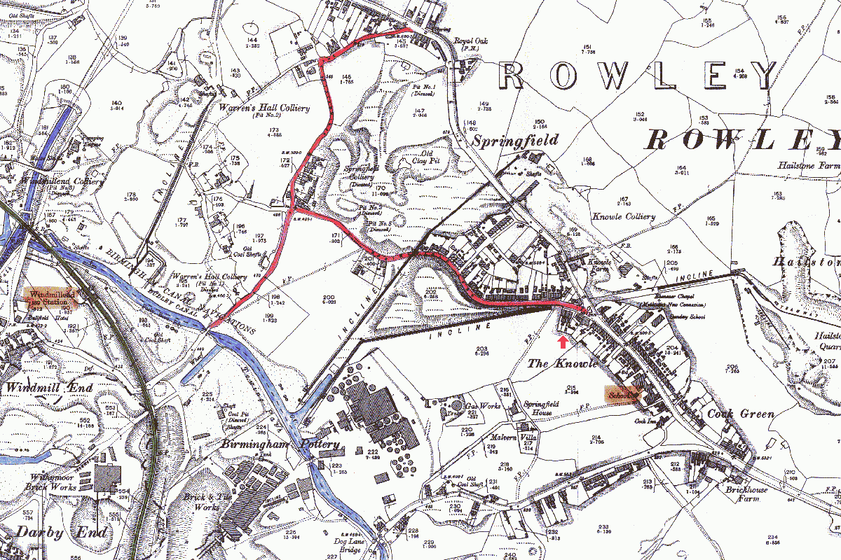 At the western end of Springfield Lane (marked in red) the road goes over the Dudley Canal (marked in blue) to Windmill End where there was a railway station on the Dudley to Halesowen line just half a mile from the Bradshaw home. In those days this would have been the easiest and quickest means of getting to Dudley, Halesowen or Birmingham. There were no buses in 1901 and roads would have been in poor condition even by today's standards!