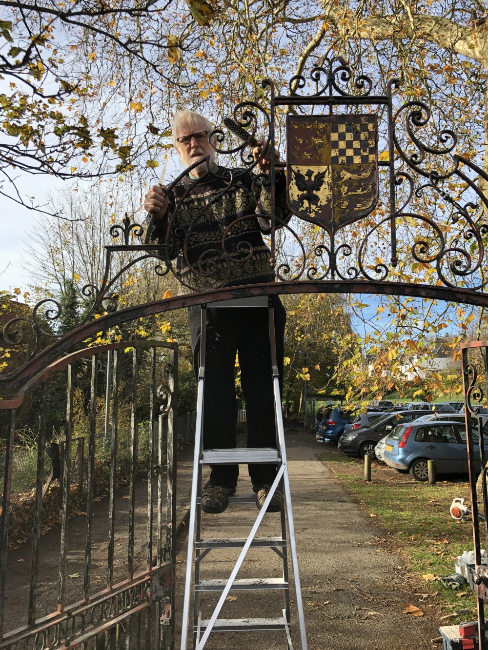 A small group of LCGSG and LCGSB ex-pupils and friends of the 2 primary schools occupying the former school, are engaged in renovating the Golden Gates - which were erected in 1963 to commemorate the Golden Anniversary of the Girls' School. The heraldic shield (escutcheon) at the top of the lintel was expertly refurbished using enamel and gold leaf during January, and the cleaned gates, posts and lintel will be repainted during February.